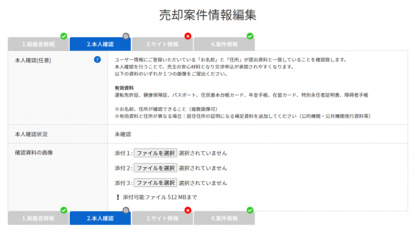 「売却案件登録」「交渉申込」を行う際に、任意で本人確認資料の提出が行えるようになりました。