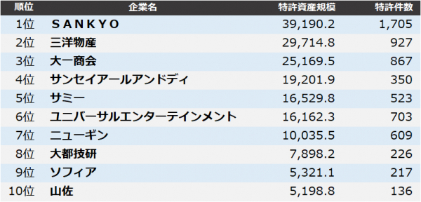 【遊技機】特許資産規模ランキング2020 トップ3はSANKYO、三洋物産、大一商会
