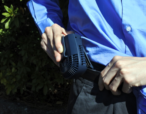 ウエストのベルト部分などに取付け、クリップで固定しマグネットクリップで上衣服を止めれば吸気口から空気を吸い込み衣服内に強力送風!汗ばむ肌を一気にクールダウンします。