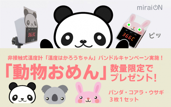 ミスターカード株式会社(本社所在地:埼玉県川口市)は、非接触式温度計「温度はかろうちゃん」シリーズを対象に「動物おめん」バンドルキャンペーンを実施します。「動物おめん」はウサギ、パンダ、コアラの3枚1セットで、温度はかろうちゃん本体に貼りつけてご使用ください。現在、お店などで消毒してもらえるけど、温度測定をなかなかしてもらえないという現場の声や、子供から高齢者まで幅広い年齢層の方に興味を持ってもらいたく「動物おめん」をご用意いたしました。入手方法は、2021年3月15日(月)出荷分から数量限定で商品に同梱して発送いたします。数量無くなり次第キャンペーンは終了とさせていただきます。