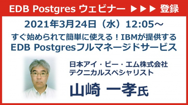 世界最大規模のPostgreSQL推進企業EDBは、IBMが提供するEDB Postgresフルマネージドサービスに関するウェビナーを2021年3月24日(水)ランチタイムに開催いたします。
