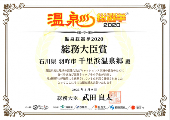 石川県羽咋市、千里浜温泉郷の宿、「ちりはまホテルゆ華」(運営委託:株式会社エムアンドエムサービス 代表取締役 小池 悟)を含む、千里浜温泉郷は2021年3月9日(火)に5回目の開催となる「温泉総選挙2020」において、初エントリーし総務大臣賞を受賞いたしました。