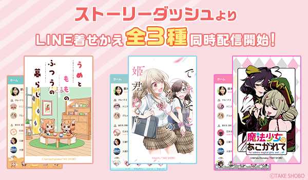 株式会社竹書房×株式会社インクルーズが贈るLINE着せかえシリーズ第8弾は、「ストーリアダッシュ」より「うめともものふつうの暮らし」、「魔法少女にあこがれて」、「できそこないの姫君たち」がLINE着せかえとなって一斉に新登場です。今後も竹書房とインクルーズのコラボレーションにより、続々とLINE着せかえの配信を予定しておりますので、是非お気に入りのLINE着せかえを見つけてみてください。