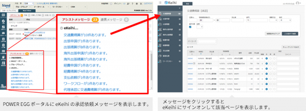 (3) POWER EGGのポータルに表示されるアシストメッセージをクリックすると、eKeihiにシングルサインオンして該当ページを表示する