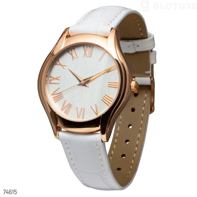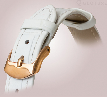 留め金はローズゴールド色のステンレス素材を用い、バンド部はホワイトに染色した牛革に型押しで仕上げています。