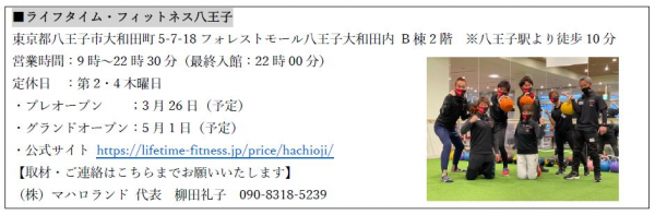 「健康寿命を 10 歳延ばす」を理念に掲げる新型フィットネスジム『ライフタイム・フィットネス』((株)マハロランド 代表:柳田礼子 ライフチアーズグループ 代表:谷けいじ 共同運営)は、2021年春にフォレストモール八王子大和田に「ライフタイム・フィットネス八王子」をグランドオープンします。
