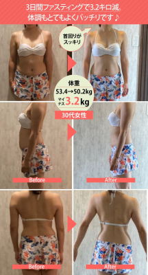 ・1月に初めて3日間ファスティングプログラムからスタートして新月と満月と皆さんと一緒にファスティングをはじめて今回3回目、出産前の体重に戻りました〜まさかここまで戻せるとは思ってもいなかったのでとっても嬉しいです!洋服を買いに行って何を着ても似合う!前はLかMかで悩んでいたのが、今はMかSかで、ニヤリとしています!