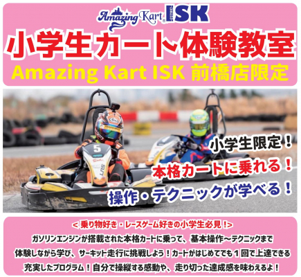 株式会社ISK(本社:静岡県浜松市西区佐浜町5757 / 代表取締役:池田多津夫)が運営するレンタルカートを取り扱うサーキット施設「Amazing Kart ISK前橋店」(住所:群馬県前橋市清野町6-3)は、2021年4月の毎週土日、「小学生向けカート体験教室」を開催します。