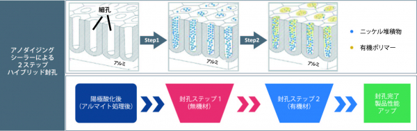 一方、無機材と有機材を使うヘンケルのハイブリッド封孔プロセスーアノダイジングシーラーでは、フッ化ニッケル(無機材)により堆積封止を行い、その後連続したライン上で有機ポリマーにより無機材の隙間を化学的堆積封止することでアルミニウムへの物理的吸収をブロックできるため、耐食性能が大幅に向上するうえ、2ステップで非常に効率が良い封孔処理が実現できます。