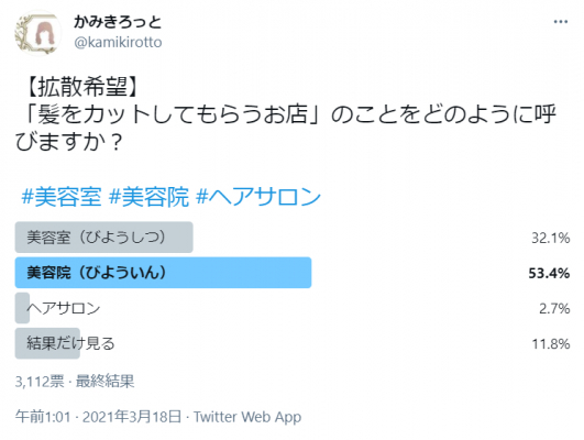 【WEBメディア「かみきろっと」3000人超えのアンケート実施】約53 %が「美容院」と呼び、約32%が「美容室」と呼ぶ