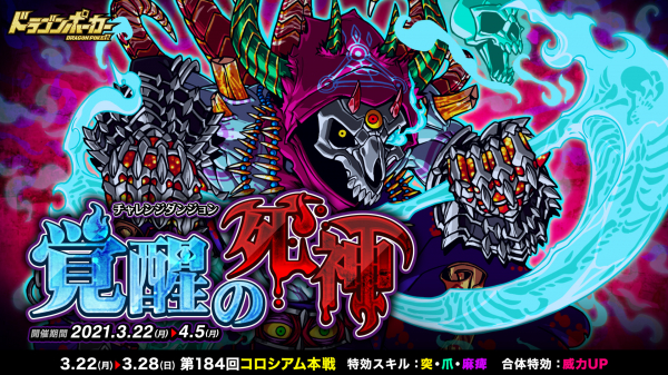株式会社アソビズム(本社:東京都千代田区、代表取締役:大手智之)は、App Store・Google Playにて好評配信中のリアルタイム合体カードバトル『ドラゴンポーカー』で、2021年3月22日(月)より、復刻チャレンジダンジョン「覚醒の死神」を開催いたします。