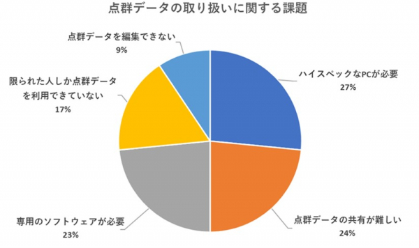 今回のセミナー参加者が感じる点群データの取り扱いに関する課題は、「ハイスペックなPCが必要」「点群データの共有が難しい」「専用のソフトウェア必要」という声が多くありました。