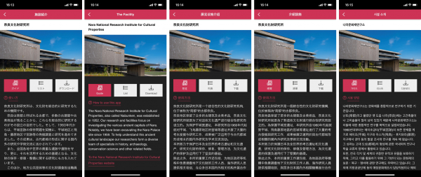 平城宮跡資料館の展示資料について、日本語・英語・中国語(繁体字・簡体字)・韓国語の画像と解説を配信しています。今後は藤原宮跡資料室、飛鳥資料館の解説配信も視野に入れています。