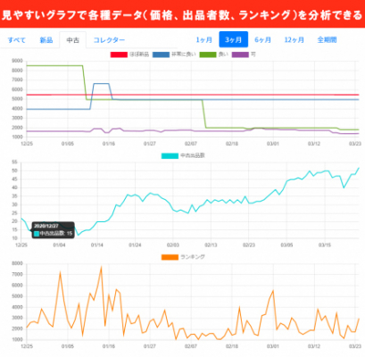 Amazon.co.jpで販売されている商品のランキングや販売個数、出品者数、時系列での価格の推移はどうなっているのかといった分析結果を必要なものはグラフ化して瞬時に表示します。