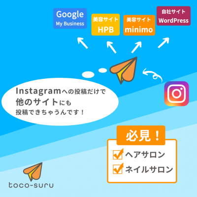 「toco-suru」(トコスル)は、Instagramへの投稿した写真とテキスト情報を、自社サイト(WordPress)、Googleマイビジネスや美容・飲食等のポータルサイトへ自動で再投稿するシステムです。