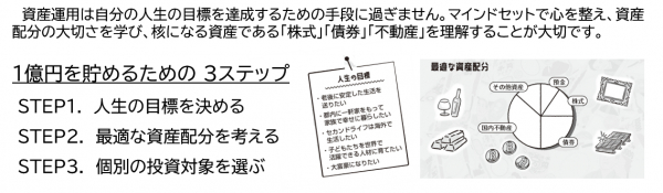 資産運用は自分の人生の目標を達成するための手段に過ぎません。マインドセットで心を整え、資産配分の大切さを学び、核になる資産である「株式」「債券」「不動産」を理解することが大切です。