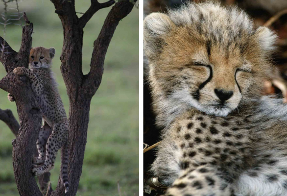 私たちだってかわいい──抜群の美しさと希少性を併せ持つサーバル、イエネコの祖といわれるアフリカンワイルドキャット、長く伸びた耳毛が特徴のカラカル、母の背中の上で眠る子どものチーター、子どもたちにお乳を与える母ライオン、木の上でのんびりくつろぐヒョウ。