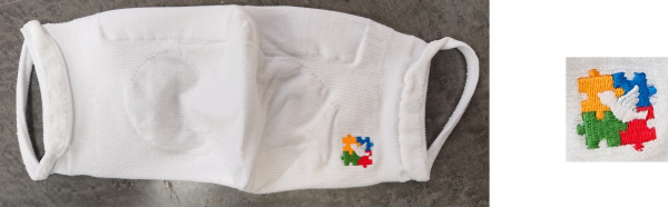六中オリジナルマスクには、生徒達が考えた刺繍を施し、4色のジグソーパズルのピースと平和のピース(Peace)が掛け合わされ、その中にハトを表現することで、『どんなカラーの人でも手を取り合って平和(安心)を作っていくことができるように』という願いが込められています。