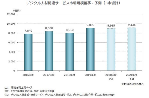 【矢野経済研究所プレスリリース】デジタル人材関連サービス市場に関する調査を実施(2021年) 2019年度のデジタル人材関連サービス市場規模(3市場計)は前年度比13.5%増の9,090億円