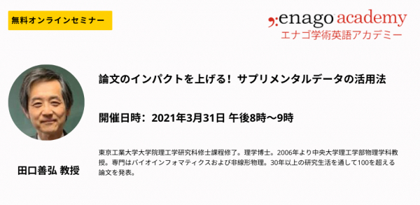 クリムゾンインタラクティブ(Crimson Interactive Pvt. Ltd.)(インド ムンバイ、代表:シャラド・ミッタル (Sharad Mittal))の運営する、エナゴ学術英語アカデミーでは、論文執筆に役立つ情報をお届けするオンラインセミナー「論文のインパクトを上げる!サプリメンタルデータの活用法」を2021年3月31日午後8時より無料で開催いたします。