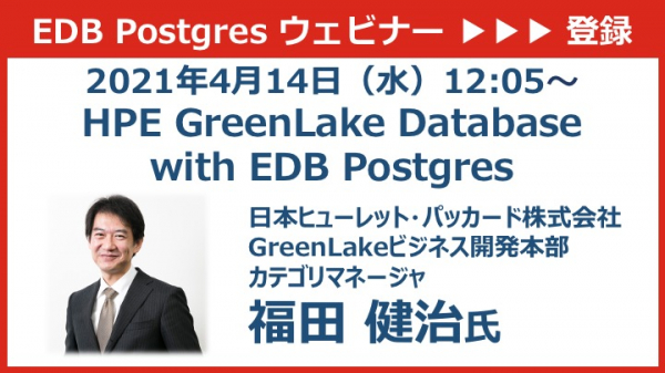 PostgreSQL推進企業EDBは「HPE GreenLake Database with EDB Postgres」と題するウェビナーを2021年4月14日(水)ランチタイムに開催いたします。