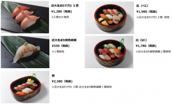 近大生まれマグロ3貫:¥1,280(税抜) / 紅(近大生まれマグロ3貫使用):¥1,980(税抜)