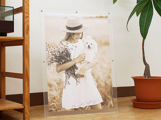 アクリル板にポスターフレームを挟み込むシンプル設計。フチの無いポスターフレームの為、飾る場所を選ばずインテリアとして最適です。