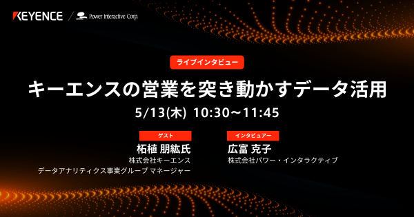 株式会社パワー・インタラクティブは、DXやデジタルマーケティングを社内でリーダーシップをとって推進する立場の方を対象に、株式会社キーエンスの柘植様をゲストにお迎えし、無料ウェビナー『キーエンスの営業を突き動かすデータ活用』(参加無料)を、5月13日に開催します。