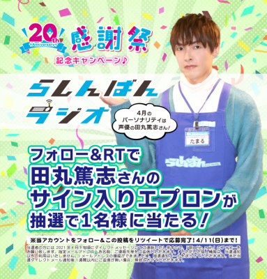 声優・田丸篤志さんサイン入りエプロンが当たる! らしんばんラジオ放送記念リツイートキャンペーンのお知らせ/中古アニメショップらしんばん