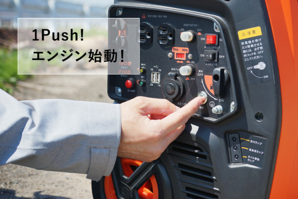 セルスタートでらくらく始動。リコイルロープを何度も引いてエンジンを掛けることがなく、力の弱い方でも安心して発電機が使えます。(もちろんリコイルロープでの始動もできます。)