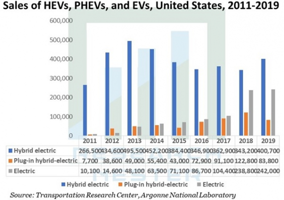 アルゴンヌ国立研究所の交通研究センターの統計によると、米国での電気自動車の販売は、2011年の10,100台から2019年には242,000台に増加しました。