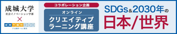 株式会社城南進学研究社(所在地:神奈川県川崎市・代表取締役社長CEO:下村勝己)が運営する大学受験専門予備校「城南予備校DUO」は、成城大学社会イノベーション学部とのコラボレーション企画「SDGs & 2030年の 日本 / 世界」をクリエイティブ・ラーニング講座としてオンラインで開催。5月29日(土)・6月26日(土)・7月22日(木/祝)の全3回、未来のために私達が何ができるのかについて探求していきます。