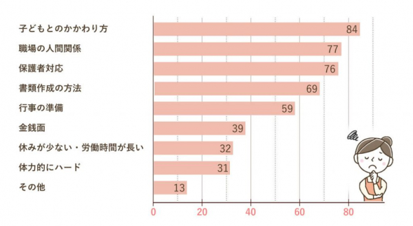 最も回答として多かったのは、『子どもとのかかわり方』でした。特に、「子どもへの注意の仕方が分からない」「自分の判断に自信が持てない」「先輩はできているのに自分にはできない」といった保育に対する不安の声が目立ちます。新人の頃は知識があってもうまく実践できない、仕事に慣れないなどの焦りや不安から、精神的に追い込まれてしまうようです。
