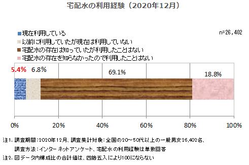 2020年の宅配水利用経験については「現在利用している」が5.4%、「以前に利用していたが現在は利用していない」が6.8%となり、宅配水の利用経験者は12.2%となっている。世代別では、高齢者の宅配水への認知度は高いものの、利用割合は低くなっており、水道水を飲用する高齢者が多いことが要因と考えられる。