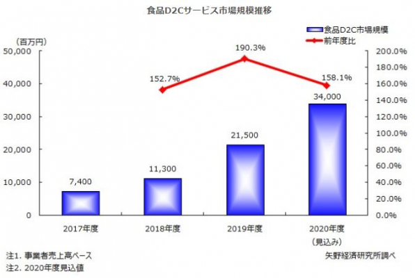 食品通販市場が追い風の状況にある中で、食品D2Cサービスについてもここ2〜3年で急激な成長を見せており、2020年度の食品D2Cサービス市場規模は前年度比158.1%の340億円を見込む。