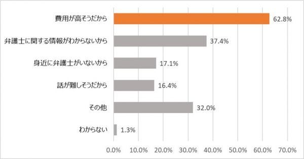 日本では国民の2割程度しか満足な司法サービスを受けられず、残り8割は法的な支援が受けられないまま泣き寝入りすることが多く、“2割司法問題”と呼ばれています。要因の1つとして挙げられるのが、費用の高さを理由に弁護士への相談を迷う、相談しない・できない人の多さにあります。下記グラフの通り、「費用が高そうだから」と答えた人の割合が62.8%と最も多くなっています。