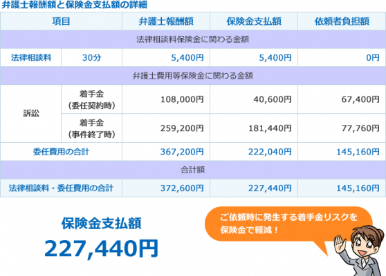 補償内容 :法律相談料保険金(限度額)、1事案:2.2万円、年間:10万円