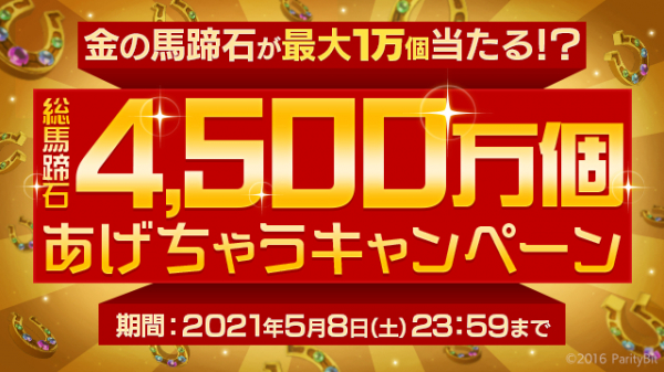 2021年5月1日(土)15:00〜2021年5月8日(金)23:59までの期間内にゲーム内にログインすると、1等「1万個」、2等「1,000個」、3等「400個」、参加賞「50個」のいずれかの金の馬蹄石がプレゼントボックスに配布されます。