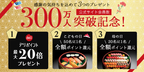 株式会社ライドオンエクスプレスホールディングス(本社:東京都港区、代表取締役社長 江見 朗)は、グループ企業が展開する、宅配寿司「銀のさら」において、公式WEBサイト・アプリ会員が300万人を突破したことを記念して、2021年5月1日(土)〜5月9日(日)の期間、「デリポイント※」を還元する3つのお得なキャンペーンを実施いたします。