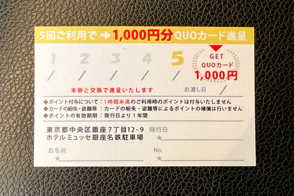 ノイパーキング銀座7丁目は『ホテルミュッセ銀座名鉄』の敷地内にあり、銀座・新橋・築地へのアプローチがしやすく、使い勝手の良さが自慢の時間貸駐車場です。利用者にスタンプカードを発行し、スタンプが5つ貯まると1,000円分のクオカードをプレゼントするという、駐車場では珍しいシステムを採用しています。