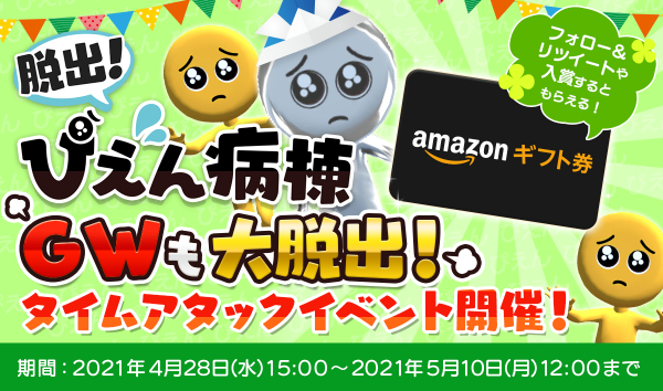 期間中、アプリゲーム「脱出!ぴえん病棟」でタイムアタックイベントにエントリーした方から、 上位入賞した方に最大20,000円分の「Amazonギフト券」を、エントリーした方から抽選で10名に「Amazonギフト券」500円分をプレゼントします!