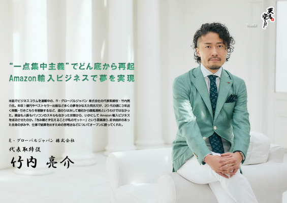 本誌でビジネスコラムを連載中の、R・グローバルジャパン 株式会社の代表取締役・竹内亮介氏。年収1億円やベストセラー出版など多くの夢をかなえた同氏だが、20 代の頃に3年近く無職・引きこもりを経験するなど、道のりは決して最初から順風満帆というわけではなかった。資金も人脈もパソコンのスキルもなかった状態から、いかにしてAmazon 輸入ビジネスを成功させたのか。「包み隠さず伝えることが私のモットー」という言葉通り、紆余曲折のあった自身の歩みや、仕事で結果を出すための思考法などについてオープンに語ってくれた。