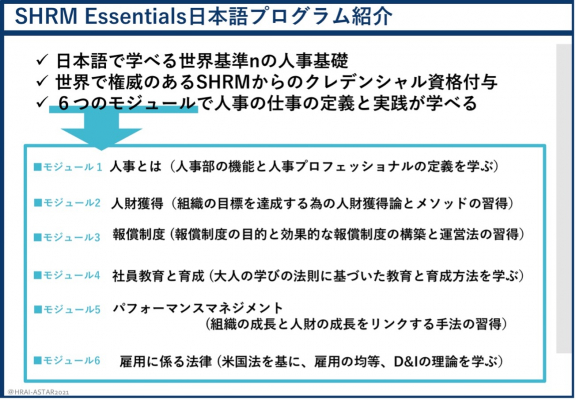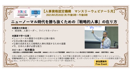 世界最大手の人事教育・資格・啓蒙機関であるシャーム(SHRM―米国人事マネジメント協会)の日本における初めてかつ唯一の公認パートナーである一般社団法人人事資格認定機構(HRAI)では2021年4月よりマンスリーウェビナー(参加費無料)を開催しています。