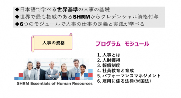 SHRMエッセンシャルズプログラムは、人事(戦略的・運営的・管理的)の役割の定義をはじめ、企業・組織にとってどのような人財を迎え入れ活躍、成長、貢献してもらうのかといった、企業・組織の文化を司る「人事哲学」の重要さも解いています。「人事哲学」に基づいた教育、評価、報償をシステムに落とし込み、人事制度の構築・運営をリードする人事。経営戦略の重要な役割を担う人事契約すなわち人事戦略をもったグローバル人事プロフェッショナルの重要性についても学ぶことができます。そういった内容から、SHRM エッセンシャルズプログラムは現在人事に携わっている人のみならず、経営者、部下を持つ管理職、これから人事の職を目指した方など幅広いビジネスパーソンに向けたプログラムとなっています。
