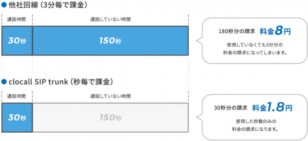 従来の通常プランは、数秒間の通話であっても1分ごと、3分ごとに通話料が集計され、無駄な費用が発生してしまいます。しかし、秒課金プランではこういった無駄を削減できます。