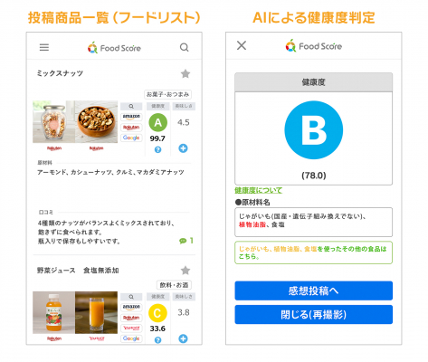「FoodScore(フードスコア)」はユーザー投稿型のサービスで、スマートフォンアプリを使って手元にある食品の健康度を即時に判定できるほか、他のユーザーが投稿した食品の原材料名や健康度を見ながら買い物をすることも可能です。投稿された食品のリストは、アプリとPCから閲覧できます。