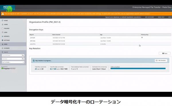 ● データ暗号化キーのローテーション: MOVEit 2021 を使うと、セキュリティ管理者は、セキュリティの観点から暗号化に使用するパスフレーズ(データ暗号化キー)を定期的に変更し、保存されている暗号化データを再編できます。再編成はスケジューリングすることができ、これにより、大事なデータ、設定情報、アカウント情報を情報漏洩などのセキュリティインシデントから守ることができます。