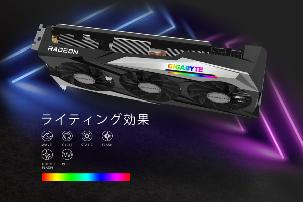 なお、GIGABYTE Radeon RX 6700 XT GAMING OC 12Gにファンが3つ備えております。隣接するファンを逆方向に回し、2つのファンの間の空気の流れる方向が一緒になり、乱気流を減らせ、エアフローが効果的に向上します。重めなゲームや、作業する時でも、スムーズに体験できます。