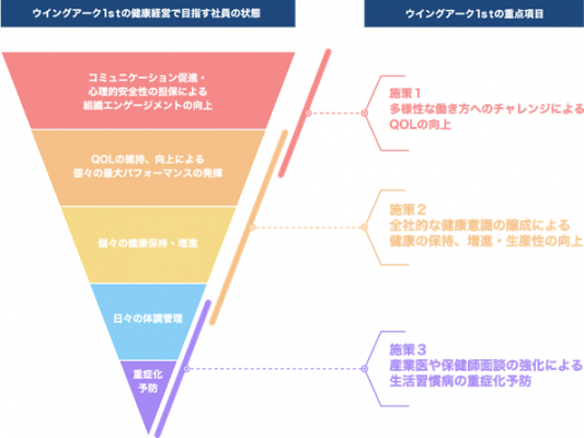 当社では、「多様な働き方へのチャレンジによるQOL向上」、「全社的な健康意識の醸成による健康の保持、増進・生産性の向上」、「産業医や保健師面談の強化による生活習慣病の重症予防」の3つの重要項目に基づいた施策の実施により、社員の心身の健康向上を目指しています。