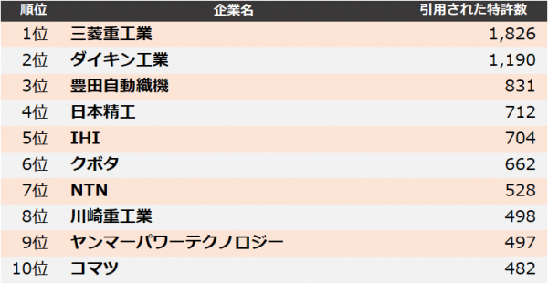 集計の結果、2020年に最も引用された企業は、1位 三菱重工業、2位 ダイキン工業、3位 豊田自動織機となりました。